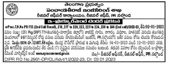 Tender is invited for 9 BT Renewal road works and other works in Jajireddy Gudem, Nagaram, Maddirala, Nutanakal and Tungaturthi Mandals of Tungathurthi-Suryapet District and other works at FR Nalgonda