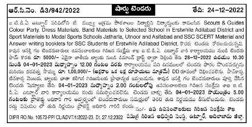 Tender is invited for answer writing booklets for SSC Students of Erstwhile Adilabad District.