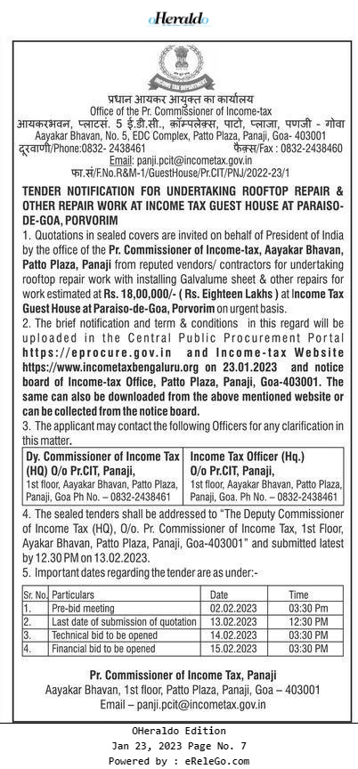 TENDER NOTIFICATION FOR UNDERTAKING ROOFTOP REPAIR & OTHER REPAIR WORK AT INCOME TAX GUEST HOUSE AT PARAISO- DE-GOA, PORVORIM