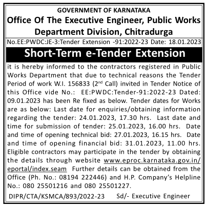 Tender Period of work W.I. 156833 (2nd Call) in GOVERNMENT OF KARNATAKA Office Of The Executive Engineer, Public Works Department Division, Chitradurga