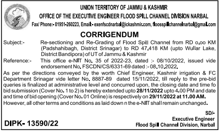 Tender Re-sectioning and Re-Grading of Flood Spill Channel from RD 0.00 KM to RD 47.418 KM of UT of Jammu & Kashmir