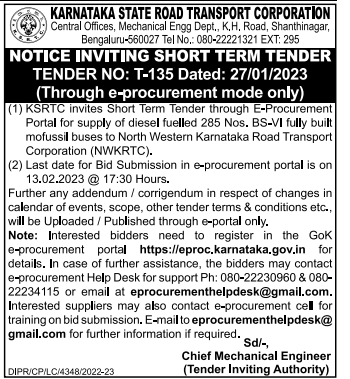 (1) KSRTC invites Short Term Tender through E-Procurement Portal for supply of diesel fuelled 285 Nos. BS-VI fully built mofussil buses to North Western Karnataka Road Transport Corporation (NWKRTC).