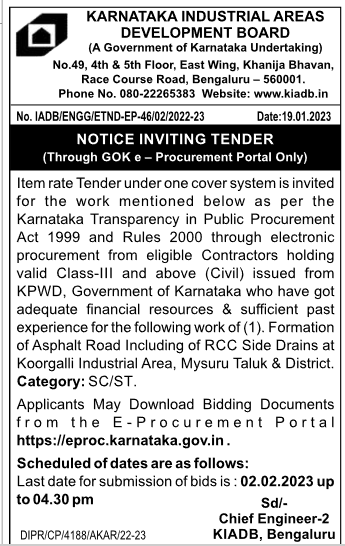 Tender under one cover system is invited for the work mentioned below as per the Karnataka Transparency in Public Procurement Act 1999 and Rules 2000 through electronic procurement from eligible Contractors holding valid Class-III and above (Civil) issued from KPWD, Government of Karnataka who have got adequate financial resources & sufficient past experience for the following work of (1).