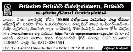 tendering are invited by the Marketing Department of T.T.D Devasthans for the supply of “90,000 Kgs.