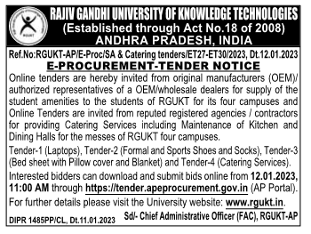 Online tenders are hereby invited from original manufacturers (OEM) authorized representatives of a OEM/wholesale dealers for supply of the student amenities to the students of RGUKT for its four campuses and Online Tenders are invited from reputed registered agencies / contractors for providing Catering Services including Maintenance of Kitchen and Dining Halls for the messes of RGUKT four campuses.