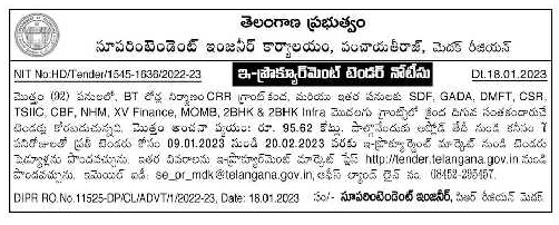 Tenders are invited by the undersigned out of total (92) works, construction of BT Roads CRR Grand Kanda, and other works under grants from SDF, GADA, DMFT, CSR, TSIIC, CBF, NHM, XV Finance, MOM8, 2BHK & 2BHK Infra etc.