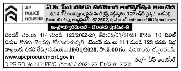Tenders are invited for 10 civil works in AP STATE POLICE HOUSING CORPORATION LTD