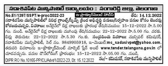 Tenders are invited for development works/maintenance works under various grants/schemes in Sadashivapet Municipality.