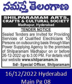 Tenders are Invited for Providing Services of Qualified Electricians 10 Persons on outsourcing basis through Man Power Supplying Agency to the premises of Shilparamam Madhapur