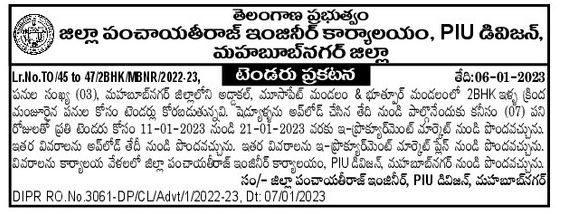 Tenders are invited for sanctioned works under 2BHK houses in Addakal, Musapet Mandal & Bhutpur Mandal of Mahbubnagar District.
