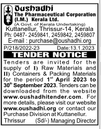 Tenders are invited for the supply of 1) Raw Materials and II) Containers & Packing Materials for the period 1st
