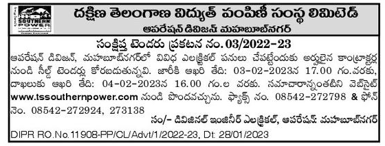 tenders are invited from eligible contractors for undertaking various electrical works in Operation Division, Mahbubnagar.