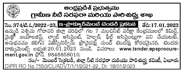 Tenders are invited from experienced agency service providers to work as Chemist, Microbiologist, Lab Assistant, Helper, Field Assistant in 7 Fresh Water Testing Centers under West Godavari district.