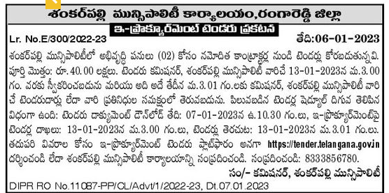 Tenders are invited from registered contractors for Development Works (02) in Shankarpally Municipality.