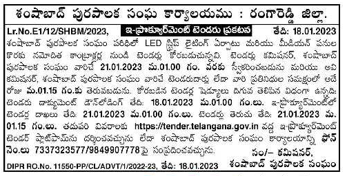 Tenders are invited from registered contractors for installation of LED strip lighting and median works within Shamshabad Municipal Corporation.