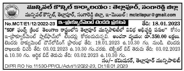 Tenders are invited on e-procurement platform for Various Development Works in Telapur Municipality of Telangana State under SDF Funds.