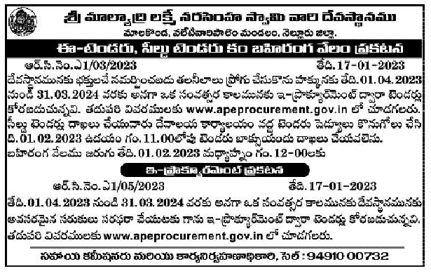 tenders are invited through e-procurement for The talneelas offered by the devotees to the temple are promoted and given to the right. a period of one year.