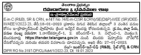 districts Online tenders are invited under e-procurement platform for Cr. No., District Name, Number of Works respectively: 1. Nagar Kurnool-1, 2. Karimnagar-1, 3. Nalgonda-1,