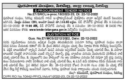 Tenders are SSA for carrying out various works by the Municipality of Sirisilla. 1. Unit rate of Napkin vending machine and incinerator machine in public toilets, 2. Unit rate of air suspension balloons, tires, batteries etc. for female toilet (mobile vehicle) 3. Play equipment and water supply pipe in various parks of the city Unit rate for inspecting and repairing lines, 4. Unit rate for repairing open gym equipment.