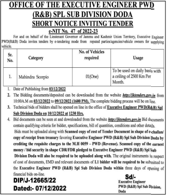 Tenders by e-mdering mode from reputed parties/agencies/vehicle owners for supplying vehicle