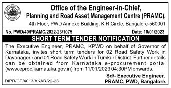 PRAMC, KPWD on behalf of Governor of Karnataka, invites short term tenders for 02 Road Safety Work in Davanagere and 01 Road Safety Work in Tumkur District.