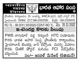 Food Corporation of India, Regional Office, Hyderabad is inviting tenders for appointment of Regular HTC at PWS Nagunur.
