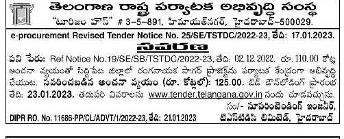 Tenders for Development of Ranganayak Sagar project as a tourist center in Siddipet district.