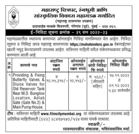 Tenders for Providing & Fixing Butterfly Valves & Sluice Valves for Old Reservoir Tank | Near M.D. Bunglow |Location, Adlab Gate (Gate No.2) & | Main Pump House.