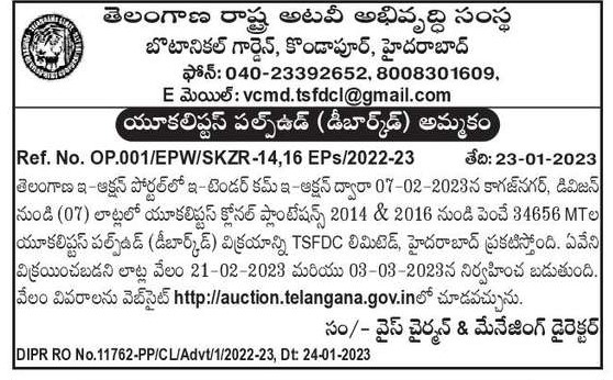 TSFDC Limited, Hyderabad announces the sale of 34656 MTe Eucalyptus Pulp Wood (Debark)