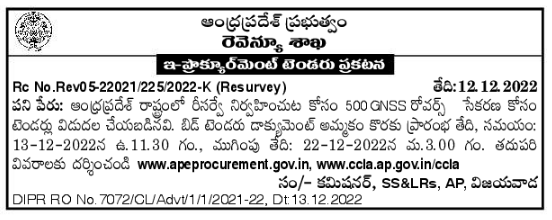 Tenders have been issued for procurement of 500 GNSS rovers for conducting resurvey in Andhra Pradesh state.