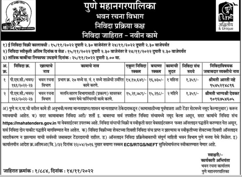sole responsibility of the tenderer will be. d) Complete information regarding online tender process will be available from Building Department, Pune Municipal