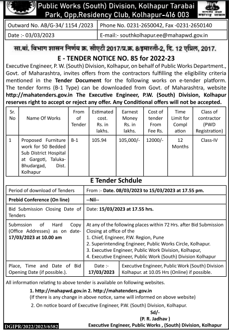Tendrer for Proposed Furniture work for 50 Bedded Sub District Hospital at Gargoti, Taluka- Bhudargad, Dist. Kolhapur