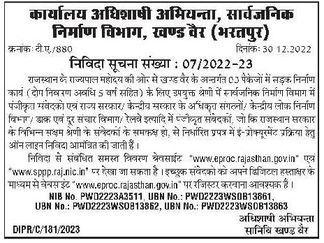 Tener for behalf of the Governor of Rajasthan, in the Public Works Department in the appropriate category for construction work (including defect removal period of 5 years) in 03 packages under Khand Vair. E-procurement in the prescribed form from registered contractors and registered contractors in State Government / Central Government