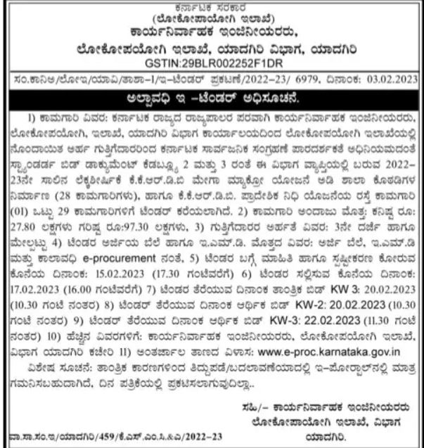 1) Details of Work: On behalf of the Governor of the State of Karnataka by the Executive Engineer, Public Works, Department, Yadgiri Divisional Office by qualified contractors registered with the Public Works Department as per Karnataka Public Procurement Transparency Act | Construction of school rooms (28 works) under KKRDB Mega Macro Project for the year 2022-23 under this section as Standard Bid Document KW 2 and 3, and KKRDB. Regional Fund Scheme Road Works | (01) Tenders have been invited for a total of 29 works.