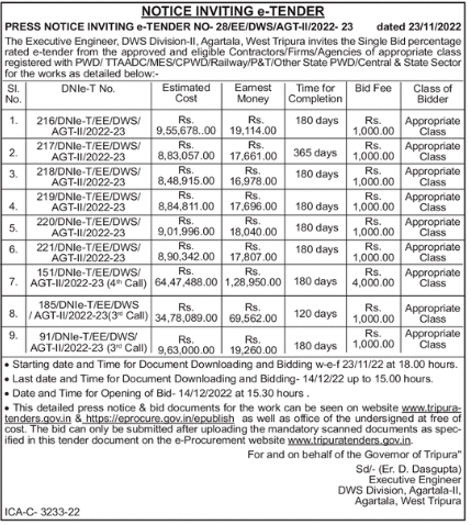 PRESS NOTICE INVITING e-TENDER NO-28/EE/DWS/AGT-II/2022-23 dated 23/11/2022