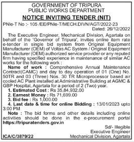The Executive Engineer, Mechanical Division, Agartala on behalf of the ‘Governor of Tripura’, invites online item rate e-tender in single bid system from Original Equipment Manufacturer (OEM) of Voltas AC System /Onginal Equipment