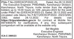 The Executive Engineer, PWD(R&B), Kanchanpur Division, Kanchanpur, North Tripura, invite tender PNleT No-22/EE/KCP/2022-23, Dated, 28.12.2022 and circulated vide Memo No F.8(11)EE/KCP/2022- 2023/3295-