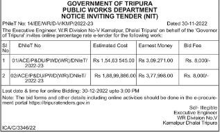 of Tripura’ invites online percentage rate e-tender for the following work: