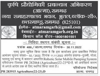 tender :- Letter No. 486 / Atma, Ramgarh dated 30.11.2022