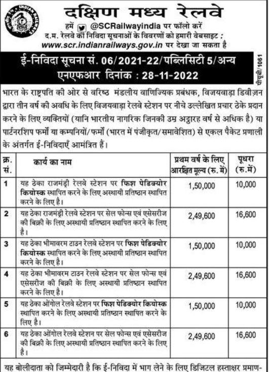 of India, for the award of the below mentioned Publicity Contracts at Vijayawada Railway Station for