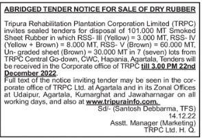 ABRIDGED TENDER NOTICE FOR SALE OF DRY RUBBER