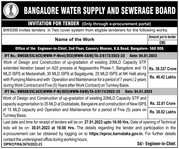 Work of Design and Construction of up-gradation of existing 20MLD Capacity STP and capacity augmentation to 35 MLD at Doddabele, Bangalore and construction of New ISPS of 15 MLD capacity and Operation and Maintenance for a period of Five (5) years on Turnkey Basis.